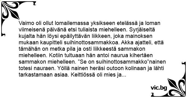 Vaimo oli ollut lomailemassa yksikseen etelässä ja loman viimeisenä päivänä etsi tuliaista miehelleen. Syrjäiseltä kujalta hän löysi epäilyttävän liikkeen, joka mainoksen mukaan kaupitteli suihinottosammakkoa. Akka ajatteli, että tämähän on metka pila ja оsтi liikkeestä sammakon miehelleen. Kotiin tultuaan hän antoi naurua kihertäen sammakon miehelleen. ”Se on suihinottosammakko”nainen totesi nauraen. Yöllä nainen heräsi outoon kolinaan ja lähti tarkastamaan asiaa. Keittiössä oli mies ja sammakko.” Mitä ihmettä sinä täällä kolistelet?” nainen kysyi. Mies vastasi ” Se on semmoinen juttu, että jos tuo osaa vähänkään kokata niin sinä saat lähteä…”