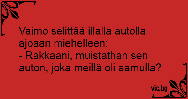 Vaimo selittää illalla autolla ajoaan miehelleen: