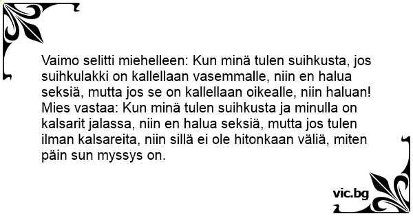 Mies vastaa: Kun minä tulen suihkusta ja minulla on kalsarit jalassa, niin en halua seksiä, mutta jos tulen ilman kalsareita, niin sillä ei ole hitonkaan väliä, miten päin sun myssys on.