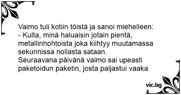 La maquina de los tres segundos Η ζυγαριά. Η επέτειος. Скъпи, за рожденият си ден искам нещо такова, че като стъпя на педала му да вдига до 100 за под три секунди! Жена ми започна да подмята какво иска за подарък за предстоящата ни годишнина: Милий, подаруй мені на 8 Березня, щось таке, що б ніжкою трохи придавила, а воно так раз, і від нуля до сотні за 3 секунди! Un Allemand, un Hollandais et un Belge sont assis dans le café. L'Allemand annonce fièrement : Une femme, peu avant Noel dit à son mari qu'elle aimerait recevoir quelque chose capable de monter de 0 à 100 en plus ou moins 4 secondes... My wife and I will be celebrating our wedding anniversary soon so i asked her what she wanted. She said wanted something really really shine that goes from 0 to 200 in about 3 seconds. Είναι τρεις τύποι λέει ο πρώτος A l’approche de Noël, un homme qui souhaite se voir offrir une moto donne des indices à sa femme : Treffen sich zwei Blondinen. Sagt die eine: My wife said wanted something shiny that went from 0-150 in under 2 seconds. Kommt meine Frau heute in den Garten nachdem sie den neuen BMW der Nachbarin erblickt hat: "Du, Hans, ich brauch auch so ein Ding mit dem ich innerhalb von fünf Sekunden auf Hundert komme!" "Naja, so habe ich ihr eine Badzimmerwaage gekauft..." Adam och Jonatan satt och skröt för varandra. Adam sa: - Min pappa har en sportbil som går från 0 till 100 km på sju sekunder. Jonatan kontrar: - Det var väl inget. Min pappa har en apparat som går från 0 till 100 på bara en sekund. - Du... Una esposa descontenta con su carro le dice a su marido: - Cariño, el día de San Valentín sorpréndeme y regálame algo que pase de 0 a 100 en 4 segundos, de ser posible de color azul. El marido le... — Любий! Подаруй мені те, що за 4 секунди розганяється від 0 до 100. — Ваги? - Hvad er det accelererer fra 0-100 på 0,5 sekunder? - Badevægten, når min svigermor bestiger den! - Kona ga meg et hint om hva hun ønsket seg på sin 50 års dag. - Hun sa at ønsket seg noe skinnende som går fra 0 til 100 på 3 sekunder. - Hva kjøpte du da? - Jeg kjøpte en baderomsvekt til henne. Tre drenge Tre drenge stod på et gadehjørne. Pludselig siger den ene: - Min far har en bil, der kan accelerere fra nul til hundrede på 6 sekunder. Den anden dreng siger: - Min far har en bil, der... 3 Vrienden zitten bij mekaar en ze praten over wat ze voor hun vrouw als verjaardagscadeau hebben gekocht. Zegt de eerste: "Ik heb voor mijn vrouw iets gekocht dat van 0 naar 100 gaat in 5... Mijn vrouw gaf me laatst een tip voor wat ze wenste voor haar volgende verjaardag.Ze zei: "Ik wil een rode en hij moet van 0 naar 130 gaan in 3 seconden." Ik kocht voor haar een weegschaal.Toen is... Viime vuonna Pertti ei tiennyt mitä ostaa vaimolleen joululahjaksi. Vaimo antoi mielestään hyvän vihjeen: ”Olisi kiva jos tossa autotallin edessä olisi minulle sellainen lahja, joka menee nollasta... Mies oli autuaasti unohtanut vaimon syntymäpäivän ja vaimo naama punaisena huutaa pihalla: PRKL, jos huomenaamuna autotallin oven edessä ei ole jotain uutta, punaista ja mistä neula nousee 5... Nainen pyysi mieheltään syntymäpäivälahjaksi jotain mikä kiihtyisi nollasta sataan 3 sekunissa. - Mies toi vaa’an naiselle. Megkérdeztem a nejemet mit szeretne a születésnapjára. Azt mondta, legyen piros és 3 mp alatt gyorsuljon 0-ról 100-ra. Vettem neki egy piros fürdőszobamérleget. Azóta nem áll velem szóba. Min fru sa att hon i bröllopspresent, ville ha en sportig liten sak som gick från 0 till 100 på ett ögonblick. Så jag gick till Konsum och köpte en snygg badrumsvåg... Elle voulait un truc qui va de 0 à 100 en 2 secondes, je lui ait offert une balance, c'est là que notre dispute à commencé... - A feleségem meglátta a szomszéd nejének az új BMW-jét, azóta nyaggat, hogy vegyek neki valamit, amivel gyorsabban van százon, mint 5 másodperc. Vettem neki egy fürdőszobamérleget. A mulher faz aniversário e pede para o marido um presente. O que você quer de presente? Um que vai de 0 a 100 em 10 segundos. À noite o marido traz uma caixa e diz: — Seu presente está aqui! Ela... Tre killar sitter i bastun och skryter om vad de givit sina fruar i julklapp. Den första säger: - Gissa vad jag gav min fru? Den gör 100 på 5 sekunder! - Ingen aning, svarar de båda andra. - En... - Ma chérie, cette année, pour Noël, je vais t'offrir quelque chose qui passe de 0 à 100 en 1 seconde quand tu y montes. - Tu vas m'offrir unr voiture !? - Non, une balance ! Meine Frau letztens zu mir: "Schatz, wir sind doch Millionäre. Schenk mir doch mal zum Geburtstag etwas, was ganz schnell von Null auf 100 geht." Ihr dann eine Waage zu schenken, war auch wieder... My wife asked me to get her a birthday gift that was black and silver and went from 0 to 200 in six seconds. I got her a new bathroom scale... that's when the fighting really started. What goes up from 0 to 200 in less than 2 seconds? Yo mama's weight scale. Ζήτησε για τα γενέθλια της κάτι που να πηγαίνει 0 έως 100 σε 2 δευτερόλεπτα και της χάρισα μια ζυγαριά. Έτσι ξεκίνησε ο καυγάς… Una donna, scontenta della propria auto, dice al marito: "Tesoro, il giorno del mio compleanno potresti sorprendermi соn qualcosa che va da 0 a 100 in soli 4 secondi, preferibilmente blu!" AI suo...