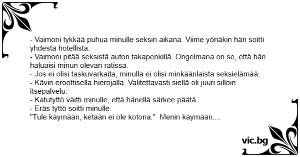 - Vaimoni tykkää puhua minulle seksin aikana. Viime yönäkin hän soitti yhdestä hotellista.