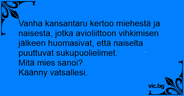 Vanha kansantaru kertoo miehestä ja naisesta, jotka avioliittoon vihkimisen jälkeen huomasivat, että naiselta puuttuvat sukupuolielimet.