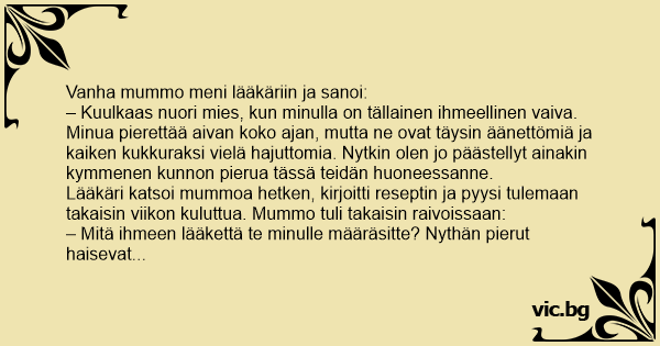 Lääkäri katsoi mummoa hetken, kirjoitti reseptin ja pyysi tulemaan takaisin viikon kuluttua. Mummo tuli takaisin raivoissaan: