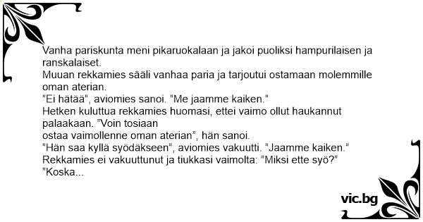 ”Ei hätää”, aviomies sanoi. ”Me jaamme kaiken.”