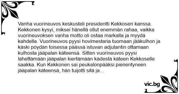 Vanha vuorineuvos keskusteli presidentti Kekkosen kanssa. Kekkonen kysyi, miksei hänellä ollut enemmän rahaa, vaikka vuorineuvoksen vanha motto oli ostaa markalla ja myydä kahdella. Vuorineuvos pyysi hovimestaria tuomaan jääkulhon ja käski pöydän toisessa päässä istuvan adjutantin ottamaan kulhosta jääpalan käteensä. Sitten vuorineuvos pyysi lähettämään jääpalan kiertämään kädestä käteen Kekkoselle saakka. Kun Kekkonen sai peukalonpääksi pienentyneen jääpalan käteensä, hän tuijotti sitä ja totesi: