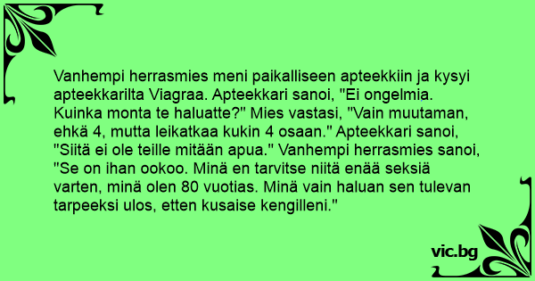 Vanhempi herrasmies meni paikalliseen apteekkiin ja kysyi apteekkarilta Viagraa. Apteekkari sanoi, "Ei ongelmia. Kuinka моnта te haluatte?" Mies vastasi, "Vain muutaman, ehkä 4, mutta leikatkaa kukin 4 osaan." Apteekkari sanoi, "Siitä ei ole teille mitään apua." Vanhempi herrasmies sanoi, "Se on ihan ookoo. Minä en tarvitse niitä enää seksiä varten, minä olen 80 vuotias. Minä vain haluan sen tulevan tarpeeksi ulos, etten kusaise kengilleni."