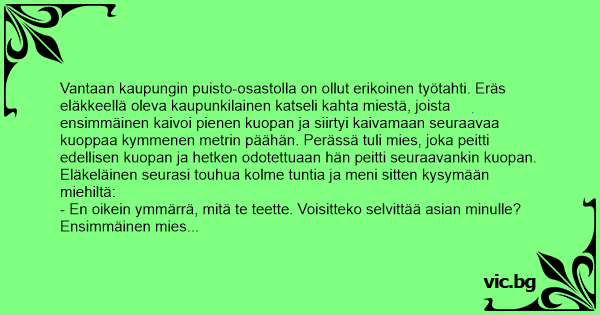 Vantaan kaupungin puisto-osastolla on ollut erikoinen työtahti. Eräs eläkkeellä oleva kaupunkilainen katseli kahta miestä, joista ensimmäinen kaivoi pienen kuopan ja siirtyi kaivamaan seuraavaa kuoppaa kymmenen metrin päähän. Perässä tuli mies, joka peitti edellisen kuopan ja hetken odotettuaan hän peitti seuraavankin kuopan.