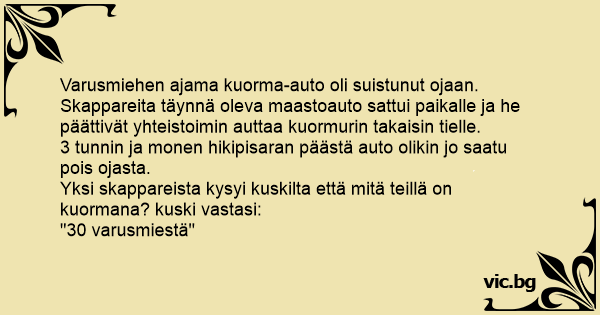 Yksi skappareista kysyi kuskilta että mitä teillä on kuormana? kuski vastasi: