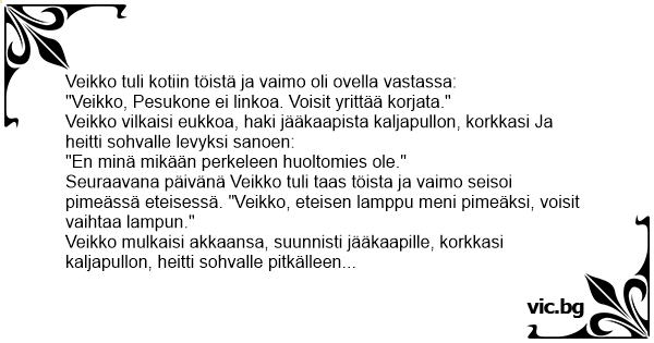 Seuraavana päivänä Veikko tuli taas töista ja vaimo seisoi pimeässä eteisessä. "Veikko, eteisen lamppu meni pimeäksi, voisit vaihtaa lampun."