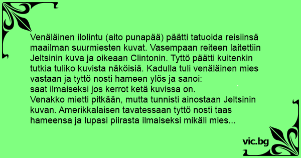 Venäläinen ilolintu (aito punapää) päätti tatuoida reisiinsä maailman suurmiesten kuvat. Vasempaan reiteen laitettiin Jeltsinin kuva ja oikeaan Clintonin. Tyttö päätti kuitenkin tutkia tuliko kuvista näköisiä. Kadulla tuli venäläinen mies vastaan ja tyttö nosti hameen ylös ja sanoi:
