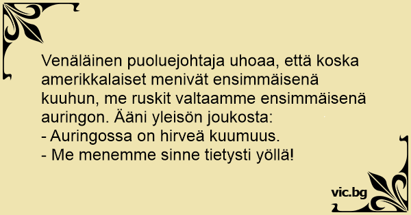 En Ryss, en Amerikan och en Arab satt och pratade.. Ryssen: - Vi var först i rymden Amerikanen: - Ja, men vi var först på månen! Araben: - Vi ska bli dom första på solen! Ryssen och Amerikanen: - Ni kommer brinna upp innan ni är framme! Araben: - Bror, vi ska dit på kvällen..