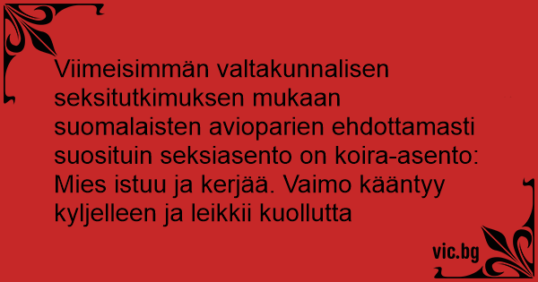 Viimeisimmän valtakunnalisen seksitutkimuksen mukaan suomalaisten avioparien ehdottamasti suosituin seksiasento on koira-asento: Mies istuu ja kerjää. Vaimo kääntyy kyljelleen ja leikkii kuollutta