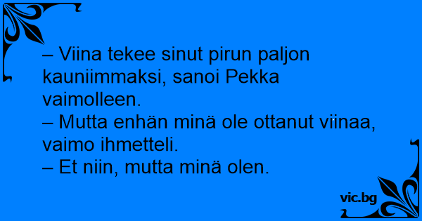 – Viina tekee sinut pirun paljon kauniimmaksi, sanoi Pekka vaimolleen.