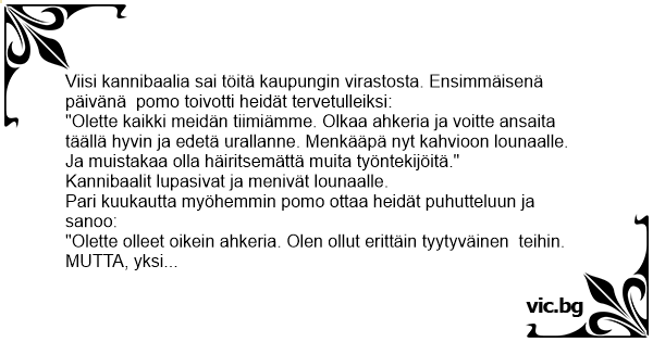 På et kontor bliver 5 kannibaler ansat som kontorassistenter. Ved tiltrædelsen siger chefen: - I har nu fast arbejde, I tjener godt og kan spise i vores kantine - så lad de andre være i fred....