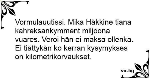Vormulauutissi. Mika Häkkine tiana kahreksankymment miljoona vuares. Veroi hän ei maksa ollenka. Ei tiättykän ko kerran kysymykses on kilometrikorvaukset.