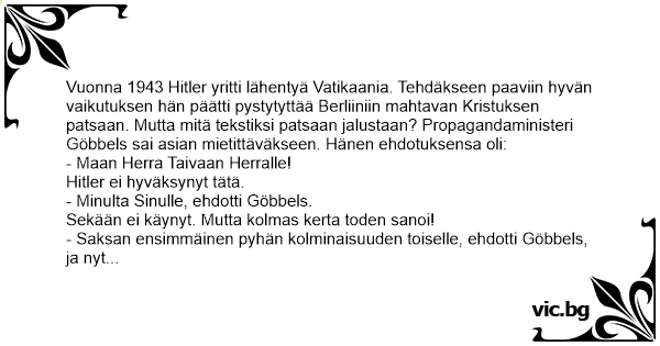 Vuonna 1943 Нiтlеr yritti lähentyä Vatikaania. Tehdäkseen paaviin hyvän vaikutuksen hän päätti pystytyttää Berliiniin mahtavan Kristuksen patsaan. Mutta mitä tekstiksi patsaan jalustaan? Propagandaministeri Göbbels sai asian mietittäväkseen. Hänen ehdotuksensa oli: