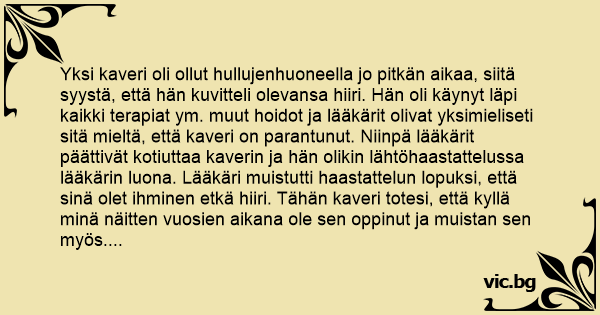 Yksi kaveri oli ollut hullujenhuoneella jo pitkän aikaa, siitä syystä, että hän kuvitteli olevansa hiiri. Hän oli käynyt läpi kaikki terapiat ym. muut hoidot ja lääkärit olivat yksimieliseti sitä mieltä, että kaveri on parantunut. Niinpä lääkärit päättivät kotiuttaa kaverin ja hän olikin lähtöhaastattelussa lääkärin luona. Lääkäri muistutti haastattelun lopuksi, että sinä olet ihminen etkä hiiri. Tähän kaveri totesi, että kyllä minä näitten vuosien aikana ole sen oppinut ja muistan sen myös. Niinpä kaveri otti tavaransa ja lähti kohti ulko-ovea. Hän avasi oven ja huomasi, että sairaan rappusilla oli kissa. Hän pyrähti ympäri ja ryntäsi takain lääkärin luo. Lääkäri oli ihmeisään ja kysyi mikä kaverilla oli hätänä: