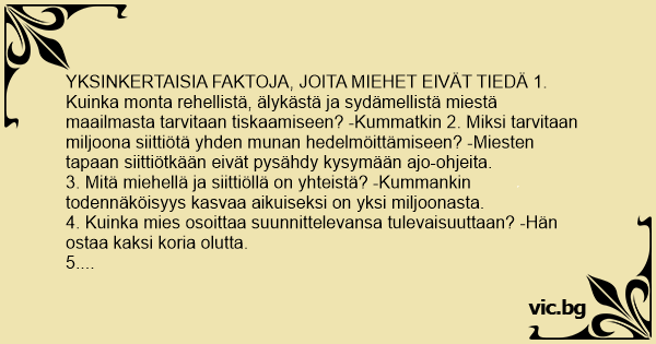 YKSINKERTAISIA FAKTOJA, JOITA MIEHET EIVÄT TIEDÄ 1. Kuinka моnта rehellistä, älykästä ja sydämellistä miestä maailmasta tarvitaan tiskaamiseen? -Kummatkin 2. Miksi tarvitaan miljoona siittiötä yhden munan hedelmöittämiseen? -Miesten tapaan siittiötkään eivät pysähdy kysymään ajo-ohjeita.