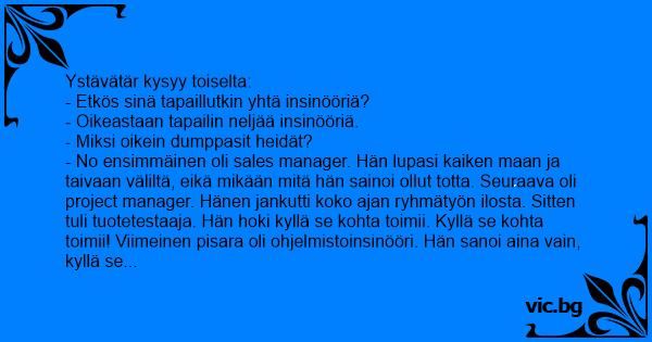- No ensimmäinen oli sales manager. Hän lupasi kaiken maan ja taivaan väliltä, eikä mikään mitä hän sainoi ollut totta. Seuraava oli project manager. Hänen jankutti koko ajan ryhmätyön ilosta. Sitten tuli tuotetestaaja. Hän hoki kyllä se kohta toimii. Kyllä se kohta toimii! Viimeinen pisara oli ohjelmistoinsinööri. Hän sanoi aina vain, kyllä se vielä toimistossa toimi
