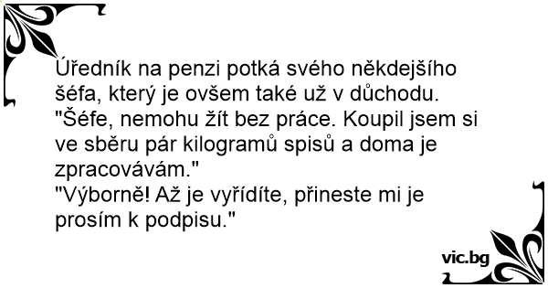 "Šéfe, nemohu žít bez práce. Koupil jsem si ve sběru pár kilogramů spisů a doma je zpracovávám."