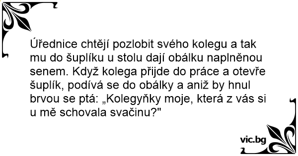 Úřednice chtějí pozlobit svého kolegu a tak mu do šuplíku u stolu dají obálku naplněnou senem. Když kolega přijde do práce a otevře šuplík, podívá se do obálky a aniž by hnul brvou se ptá: „Kolegyňky moje, která z vás si u mě schovala svačinu?"