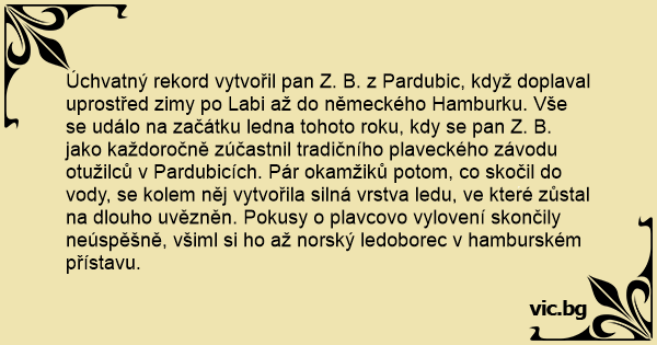 Úchvatný rekord vytvořil pan Z. B. z Pardubic, když doplaval uprostřed zimy po Labi až do německého Hamburku. Vše se událo na začátku ledna tohoto roku, kdy se pan Z. B. jako každoročně zúčastnil tradičního plaveckého závodu otužilců v Pardubicích. Pár okamžiků potom, co skočil do vody, se kolem něj vytvořila silná vrstva ledu, ve které zůstal na dlouho uvězněn. Pokusy o plavcovo vylovení skončily neúspěšně, všiml si hо až norský ledoborec v hamburském přístavu.