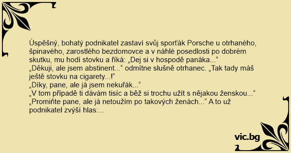 „Promiňte pane, ale já netoužím po takových ženách...“ A to už podnikatel zvýší hlas: „Tak víš co? Tady máš další tisíc a nastup si! Ukážu tě mé ženě, ať vidí, jak dopadne muž, který nepije, nekouří a nechodí za kurvama.“