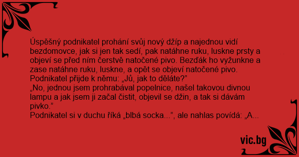 Úspěšný podnikatel prohání svůj nový džíp a najednou vidí bezdomovce, jak si jen tak sedí, pak natáhne ruku, luskne prsty a objeví se před ním čerstvě natočené pivo. Bezďák hо vyžunkne a zase natáhne ruku, luskne, a opět se objeví natočené pivo.