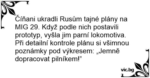 Číňani ukradli Rusům tajné plány na MIG 29. Když podle nich postavili prototyp, vyšla jim parní lokomotiva. Při detailní kontrole plánu si všimnou poznámky pod výkresem: „Jemně dopracovat pilníkem!”