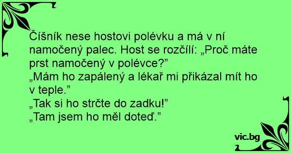 Číšník nese hostovi polévku a má v ní namočený palec. Host se rozčílí: „Proč máte prst namočený v polévce?”