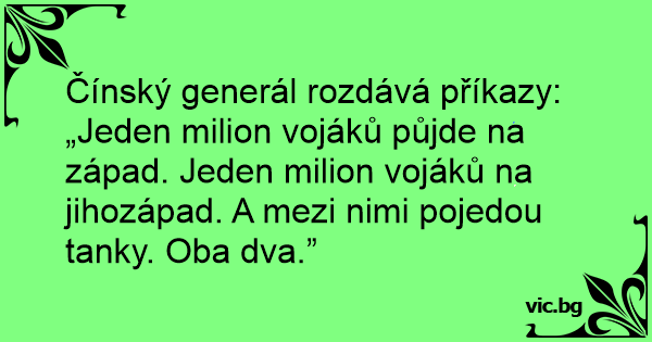 Čínský generál rozdává příkazy: „Jeden milion vojáků půjde na západ. Jeden milion vojáků na jihozápad. A mezi nimi pojedou tanky. Oba dva.”