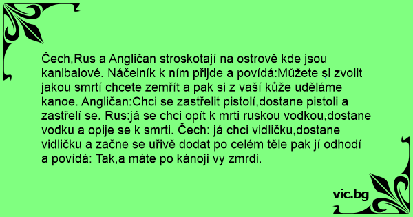 A Frenchman, and Englishman and a New Yorker Cannibals capture three men. The men are told that they will be skinned and eaten and then their skin will be used to make canoes. Then they are each given a final request. Im Dschungel sind drei Männer unterwegs. Plötzlich gelangen sie in die Hände von Kannibalen. Die Kannibalen möchten die drei essen. Sagt der Häuptling: Американец, французин, руснак и българин се спасили след корабокрушение, но на острова попаднали в плен на людоедско племе. Tres misioneros son capturados por una tribu de caníbales. El jefe caníbal les dice: Ustedes tener que pedir algo que no poder cumplir y yo dejar vivir, sino comérmelos y utilizar su piel para... 3 men go on a business trip to an island, one was from Russia one was from London and the other was from New York. The has never been discovered by anyone till now so they didn't now what they were... C'est un français, un américain et un belge en expédition dans la jungle tropicale. Alors qu'ils marchaient tranquillement, leur machette à la main, une tribune de cannibales arrive, les capture et... A finn, a dán és a svéd Afrikába utazik. Mindhárman részt vesznek egy szafarin, ahol emberevő kannibálok támadnak rájuk. A törzsfőnök előlép és közli: - Mi kannibálok vagyunk, megeszünk benneteket... Nordmannen, svensken og dansken var fanget av kannibaler. Kanibalene sa at de skulle bruke Skinnet deres til å lage kano. Men først skulle alle tre få oppfylt hvert sitt ønske. Dansken ønsket seg... Kanibalové uvězní tři lidi na ostrově a kapitán povídá: Z vaší kůže si uděláme kánoj. Najednou jeden z lidí vytrhne nůž z kanibalovy ruky a bodá se. "Co to do prdele děláš?" ptá se nechápavě... En svensk, en finne och en norrman jobbade på ett oljefartyg. Detta förliste och de tre männen tog sig iland på en ö. Efter en stund Kom ett gäng kannibaler och band dem vid en totempåle. Sedan sa... Un américain, un français et un belge sont en expédition dans la jungle et se font capturer par des cannibales... Ceux-ci leur expliquent: - Notre sorcier est un très grand sorcier! Si vous lui... Trois explorateurs s’enfoncent de plus en plus profondément dans la jungle encore inviolée, terrae incognitae. Pas de chance, car après le troisième jour, ils sont capturés par la redoutable tribu,... Cairam um portuga, um americano e um judeu numa ilha e foram pegos por uma tribo de canibais o chefe disse:vou cortar a pele de voces para um barquinho! o americano diz: mas sem aposta? o chefe diz... Um portugues, um brasileiro e um americano foram presos por varios canibais, quando o chefe deles fala ''vou dar uma chance para voces, voces pedem um objeto e se nós encontrarmos, a sua carne... Um avião caiu na selva e apenas 3 pessoas se salvaram. Logo chegaram canibais dizendo que os matariam e com a pele fariam canoas. Os caras aterrorizados, ajoelharam e pediram para que os canibais... Anglą, prancūzą ir lietuvį pagrobia žmogėdros. Prieina prie jų vyriausias ir sako: - Bloga žinia yra tai, kad mes jus pagavom ir suvalgę iš jūsų odų darysim kanoją. Gera žinia tai, kad jūs galit...