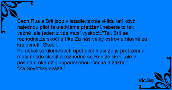 Čech,Rus a Brit jsou v letadle,takhle vklidu letí když najednou pilot řekne:Máme přetížení,neberte to tak vážně ,ale jeden z vás musí vyskočit."Tak Brit se rozhodne,že skočí a říká:Za náš velký ostrov a hlavně za královnu!!" Skočil.