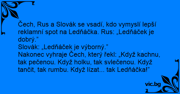 Čech, Rus a Slovák se vsadí, kdo vymyslí lepší reklamní spot na Ledňáčka. Rus: „Ledňáček je dobrý.”