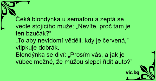 Čeká blondýnka u semaforu a zeptá se vedle stojícího muže: „Nevíte, proč tam je ten bzučák?”