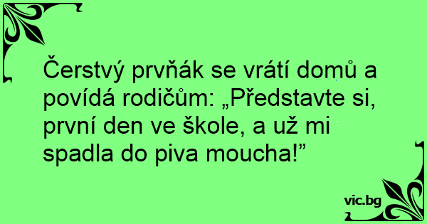 Čerstvý prvňák se vrátí domů a povídá rodičům: „Představte si, první den ve škole, a už mi spadla do piva moucha!”