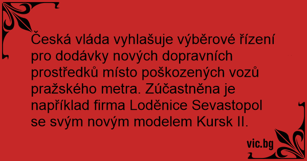 Česká vláda vyhlašuje výběrové řízení pro dodávky nových dopravních prostředků místo poškozených vozů pražského metra. Zúčastněna je například firma Loděnice Sevastopol se svým novým modelem Kursk II.