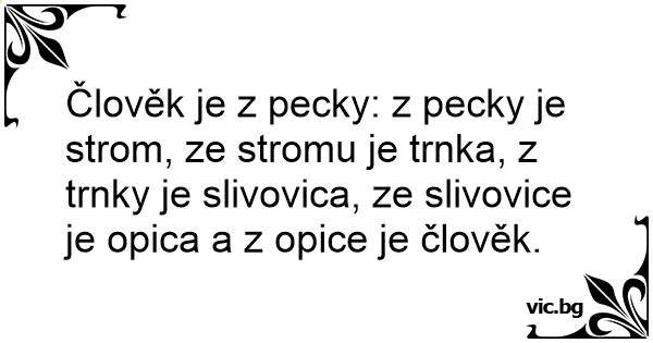 Člověk je z pecky: z pecky je strom, ze stromu je trnka, z trnky je slivovica, ze slivovice je opica a z opice je člověk.