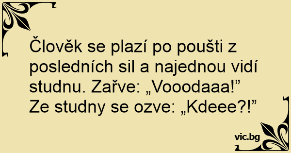 Člověk se plazí po poušti z posledních sil a najednou vidí studnu. Zařve: „Vooodaaa!”