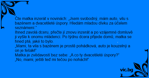 Čte matka inzerát v novinách: „Jsem svobodný, mám auto, vilu s bazénem a dvacetileté úspory. Hledám mladou dívku za účelem seznámení.”