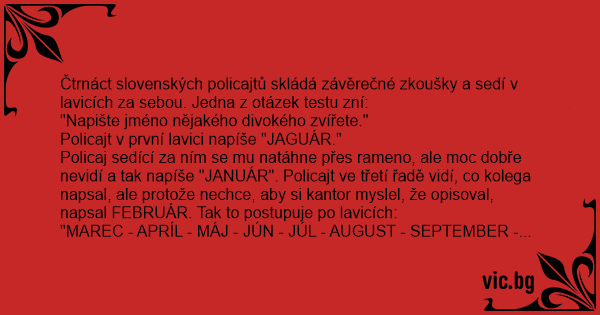 Čtrnáct slovenských policajtů skládá závěrečné zkoušky a sedí v lavicích za sebou. Jedna z otázek testu zní: