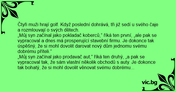 „Můj syn začínal jako prodavač aut,” říká ten druhý, „a pak se vypracoval tak, že sám vlastní několik obchodů s auty. Je dokonce tak bohatý, že si mohl dovolit věnovat svému dobrému příteli úplně nové luxusní auto.”