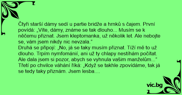 Druhá se připojí: „No, já se taky musím přiznat. Tíží mě to už dlouho. Trpím nymfománií, ani už ty chlapy nestíhám počítat. Ale dala jsem si pozor, abych se vyhnula vašim manželům...”