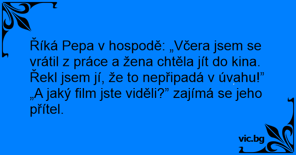 Říká Pepa v hospodě: „Včera jsem se vrátil z práce a žena chtěla jít do kina. Řekl jsem jí, že to nepřipadá v úvahu!”