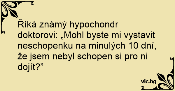 Říká známý hypochondr doktorovi: „Mohl byste mi vystavit neschopenku na minulých 10 dní, že jsem nebyl schopen si pro ni dojít?”
