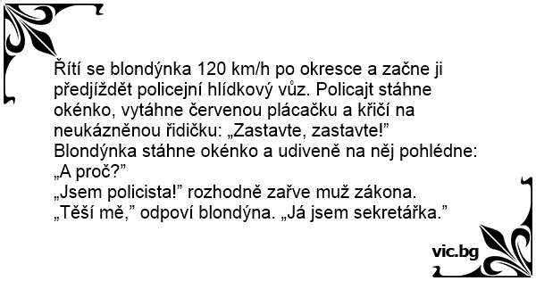 Řítí se blondýnka 120 km/h po okresce a začne ji předjíždět policejní hlídkový vůz. Policajt stáhne okénko, vytáhne červenou plácačku a křičí na neukázněnou řidičku: „Zastavte, zastavte!”