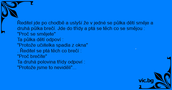 Ředitel jde po chodbě a uslyší že v jedné se půlka dětí směje a druhá půlka brečí. Jde do třídy a ptá se těch co se smějou :
