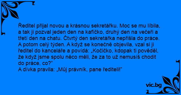 Ředitel přijal novou a krásnou sekretářku. Moc se mu líbila, a tak ji pozval jeden den na kafíčko, druhý den na večeři a třetí den na chatu. Čtvrtý den sekretářka nepřišla do práce. A potom celý týden. A když se konečně objevila, vzal si ji ředitel do kanceláře a povídá: „Kočičko, kdopak ti pověděl, že když jsme spolu něco měli, že za to už nemusíš chodit do práce, co?”