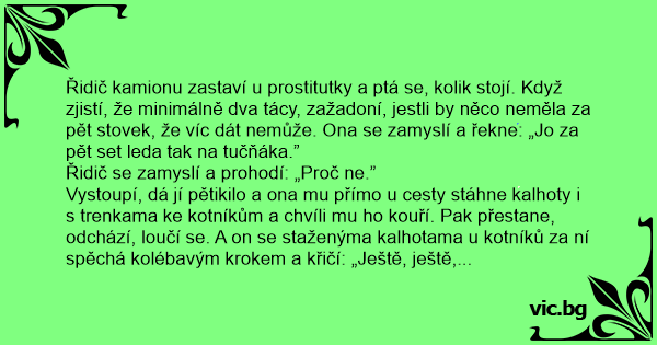 Řidič kamionu zastaví u prostitutky a ptá se, kolik stojí. Když zjistí, že minimálně dva tácy, zažadoní, jestli by něco neměla za pět stovek, že víc dát nemůže. Ona se zamyslí a řekne: „Jo za pět set leda tak na tučňáka.”
