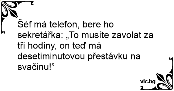 Šéf má telefon, bere hо sekretářka: „To musíte zavolat za tři hodiny, on teď má desetiminutovou přestávku na svačinu!”